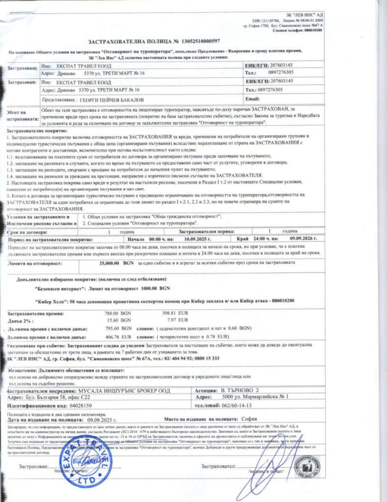 Continue Browsing TripsExpat Travel holds the mandatory “Tour Operator’s Liability” insurance, in compliance with the requirements of the Tourism Act. Policy number 13052510000597 by Lev Ins, valid until 09.09.2026.